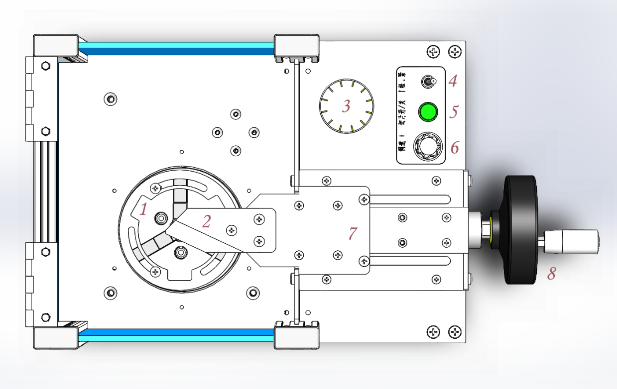 1.三爪卡盘(Lathe chuck);2.刀片(knife);3.切片厚度调节手轮(thickness wheel);4.夹持线缆开关(close/open);5.切片按钮 (on/slice);6.转速调节(Rotation speed);7.刀架机构(knife rest);8.进刀手轮(slicer wheel);