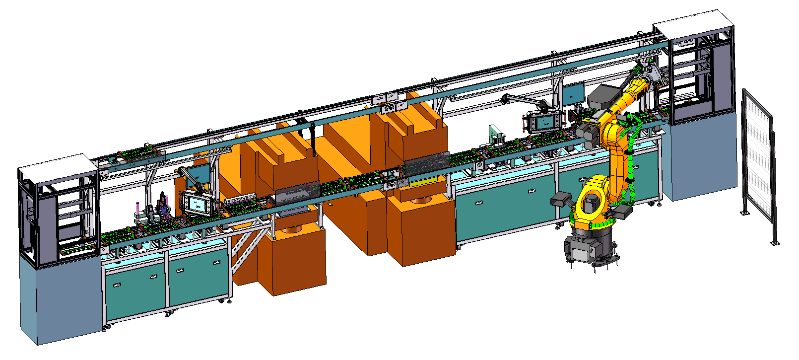 采用模条循环流转方式的全自动电源线头尾注塑成型的生产线。包括:待成型线材的自动搬运、校正、成型前检测、成型后检测等工序。每小时产量≧900条