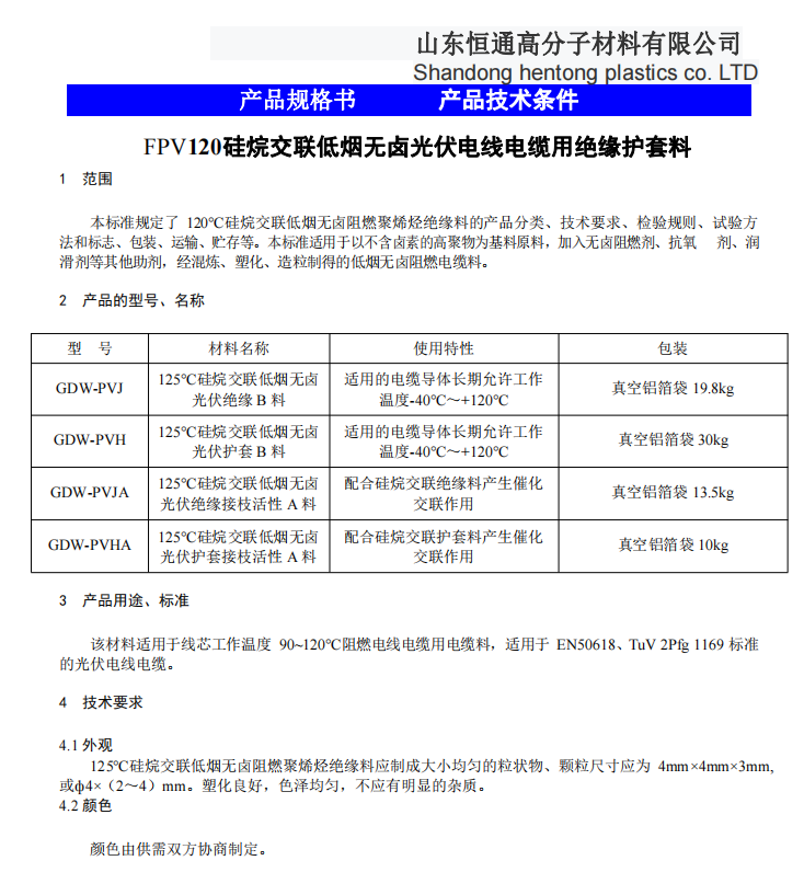 温水交联 FPV120 光伏专用符合Tuv1169 EN50618的无卤硅烷可交联绝缘料及护套料(两个型号) - 无图版