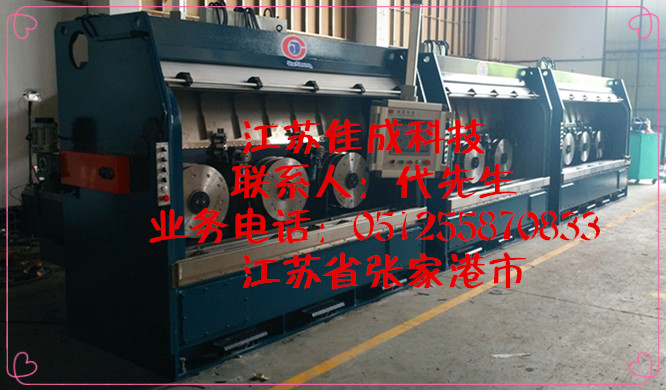 主要用于将φ8.0mm铜杆拉制成Φ1.2-4.5mm铜线。齿轮箱中斜齿材料为20CrMnTi,经渗碳淬火处理,齿面为硬齿面。拉线轮采用一列式排列,每道拉丝鼓轮分别由独立的伺服电机传动,13套毂轮及毂轮圈可相互互换。连续拉制,在线退火,机械、电气速度均衡匹配,实现快速换模。