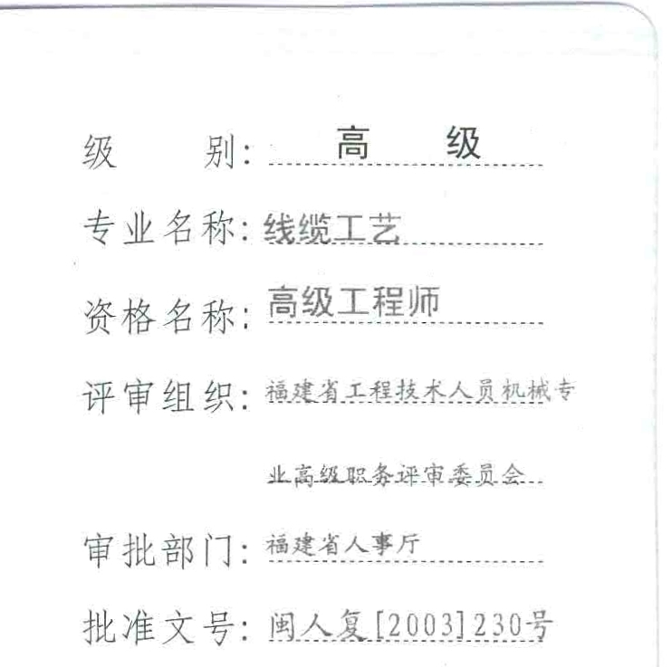 fpt913:我这边没有线缆评级,唯一能沾点边的只有机械工程师,电气工程师这两个证。