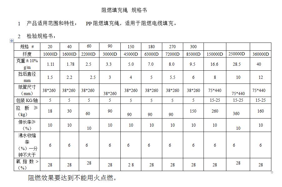 阻燃PP填充绳规格书 - 无图版