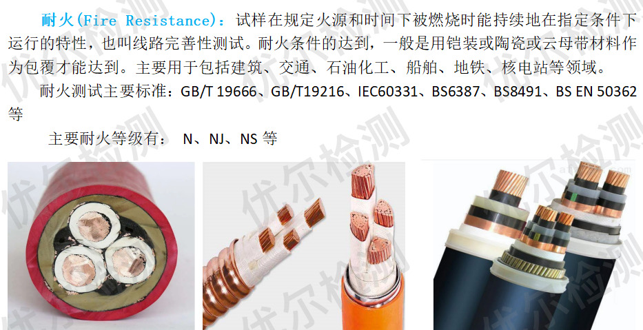 耐火??(Fire Resistance):试样在规定火源和时间下被燃烧时能持续地在指定条件下运行的特性,也叫线路完整性测试。耐火条件的达到,一般是用铠装或陶瓷或云母带或硅橡胶或矿物质作为包覆才能达到。主要用于包括建筑、?交通、?石油化工、?船舶、?地铁、?核电站等领域。