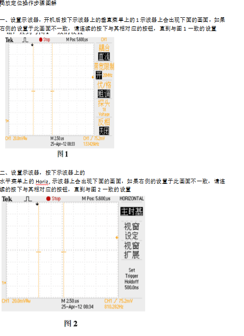 一、设置示波器,开机后按下示波器上的垂直菜单上的 1 示波器上会出现下面的画面,如果右侧的设置于此画面不一致,请连续的按下与其相对应的按钮,直到与图1一致的设置