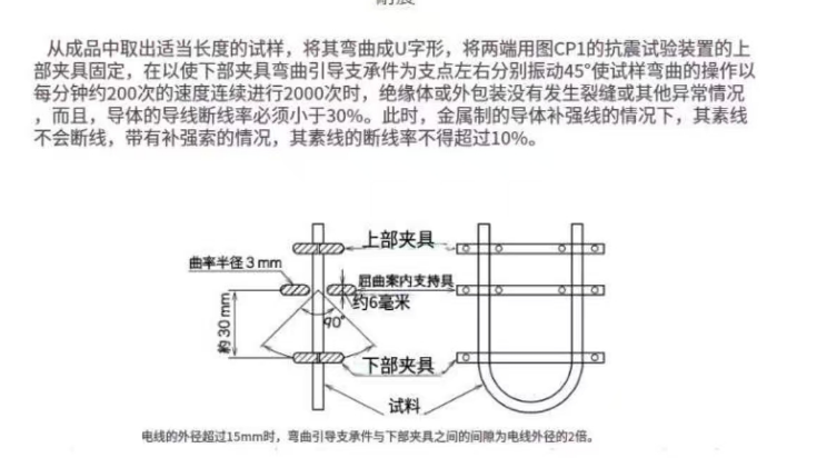 左右各以 45°摆动使试样弯曲,以每分钟约 200 次的速度连续进行 2000 次这样的操作后,绝缘体或外装不得出现破裂及其他异常情况,导体的单线断线率必须在 30% 以下。此时,若有金属制的导体补强线,其单线不得断线;若有补强索,其单线断线率不得超过 10% 。