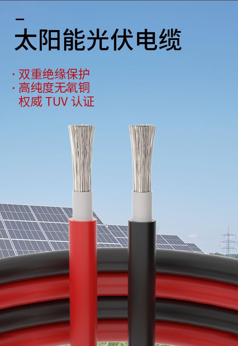 导体通常为柔性镀锡铜,绝缘层和外护套采用XLPO交联聚烯烃,具有良好的阻燃、耐化学腐蚀和耐油性能。额定电压交流通常为 AC1000V/DC1500V,最大电压可达 1800V,测试电压为 6.5kV 交流。工作温度范围一般为 - 40℃至 + 90℃,在特定条件下,导体最高温度可达 120℃(持续 20000 小时),短路时最高温度可达 250℃(最长 5 秒)。常见规格有 1.5mm2、2.5mm2、4mm2、6mm2、10mm2 等,随着截面积增大,电缆的外径和重量也相应增加,直流电阻则减小。