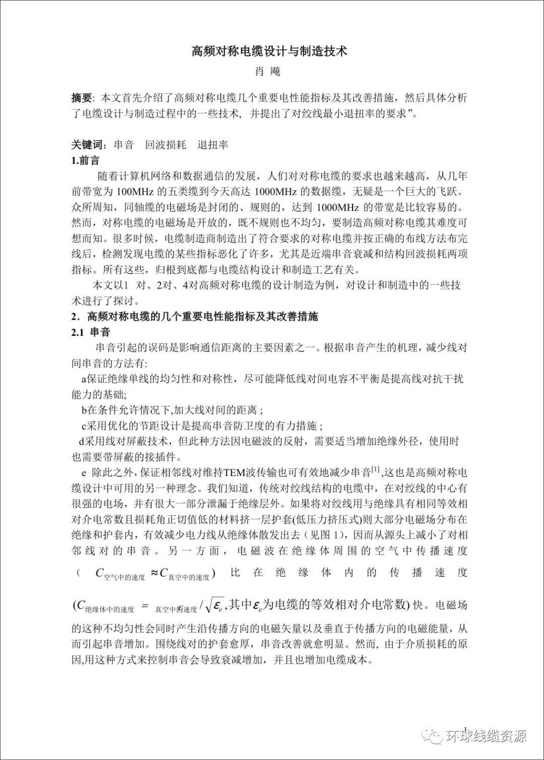 本文介绍了高频对称电缆几个重要电性能指标及其改善措施,提出了设计时需要注意事项,最后还介绍了常用的几种典型结构、特点和应用、可供有关人员参考。至于如何通过各种制造工艺,掌握主要技术关键来制造高频对称电缆,将在《对称电缆设计与制造技术之二》的论文中论述。