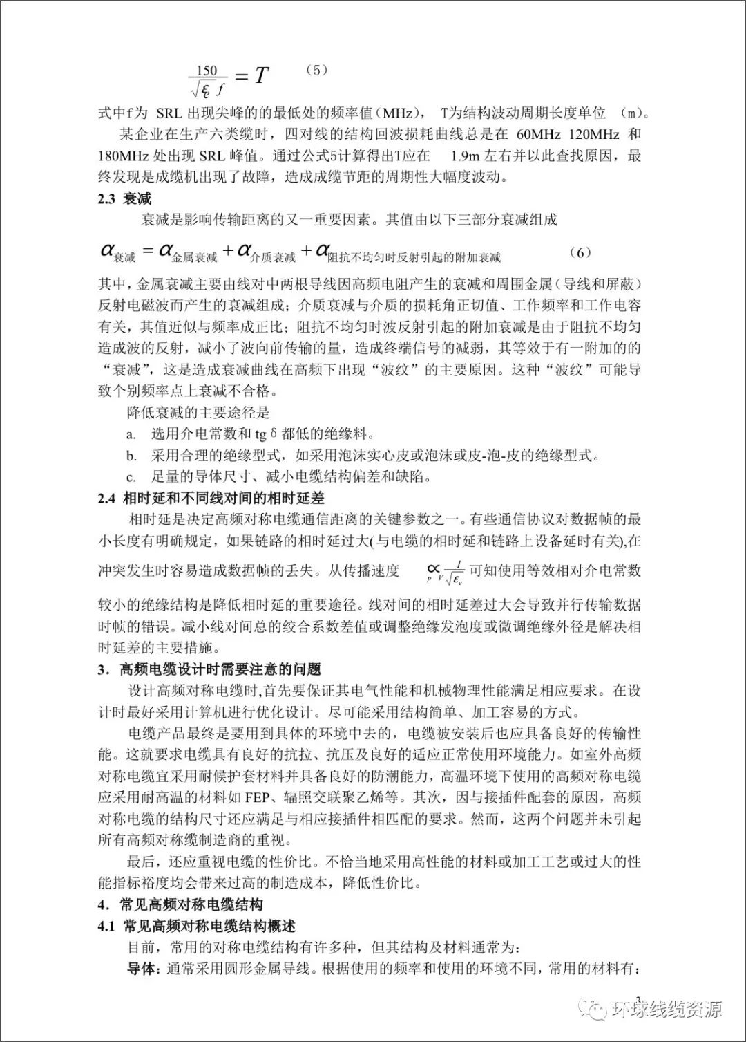 式中f为SRL:出现尖峰的最低处的频率值(MHz),T为结构波动周期长度单位(m)。某企业在生产六类缆时,四对线的结构回波损耗曲线总是在60MHz, 120 MHz和180 MHz处出现SRL峰值。通过式(5)计算得出T应在1.9 m左右并以此查找原因,最终发现是成缆机出现了故障,造成成缆节距的周期性大幅度波动。 (三)衰减 衰减是影响传输距离的又一重要因素,其值由以下三部分组成: α=α1+α2+α3 式中,α1金属衰减。主要由线对中两根导线因高频电阻产生的衰减和对周围金属(导线和屏蔽)反射电磁波而产生的衰减组成;介质衰减α2与介质的损耗、工作频率和工作电容有关,其值近似与频率成正比;阻抗不均匀时波反射引起的附加衰减α3 是由于阻抗不均匀造成波的反射,减小了波向前传输的量,造成终端信号的减弱,其等效于有以附加的“衰减”,这是造成衰减曲线在高频下出现“波纹”的主要原因。这种“波纹”可能导致个别频率点上衰减不合格。 降低衰减的主要途径是: 1.选用介电常数和tgδ都低的绝缘料; 2.采用合理的绝缘形式,如采用泡炸实心皮或泡沫或皮-泡-皮的绝缘型式; 3.足量的导体尺寸、减小电缆结构偏差和缺陷。 (四)相时延和不同线对间的相时延差 相时延是决定高频对称电缆通信距离的关键参数之一。有些通信协议对数据帧的最小长度有明确规定,若链路的相时延过大(与电缆的相时延和链路上设备延时有关),在冲突发生时易造成数据帧的丢失。从传播速度Vp∝1/√εe可知,使用等效相对介电常数较小的绝缘结构是降低相时延的重要途径。线对间的相时延差过大会导致并行传输数据时帧的错误。减小线对间总的绞合系数差值或调整绝缘发泡度或微调绝缘外径是解决相时延差的主要措施。 三、高频电缆设计时需要注意的问题 设计高频对称电缆时,首先要保证其电气性能和机械物理性能满足相应要求。在设计时最好采用计算机进行优化设计,尽可能采用结构简单、加工容易的方式。 电缆产品最终是要用到具体的环境中去的,电缆被安装后也应具备良好的传输性能。这就要求电缆具有良好的抗拉、抗压及良好的适应于正常使用环境的能力,如室外高频对称电缆宜采耐候护套材料并具备良好的防潮能力;高温环境下使用的高频对称电缆应采用耐高温的材料如四氟乙烯-六氟丙烯共聚物(FEP)、辐照交联聚乙烯等。其次,因与接插件配套的原因,高频对称电缆的结构尺寸还应满足与相应接插件相匹配的要求。然而,这个两个问题并未引起所有高频对称缆御造商的重视。 最后,还应重视电缆的性价比。不恰当地采用高性能的材料或加工工艺,或过大的性能指标裕度均会带来过高的制造成本,降低性价比。 |