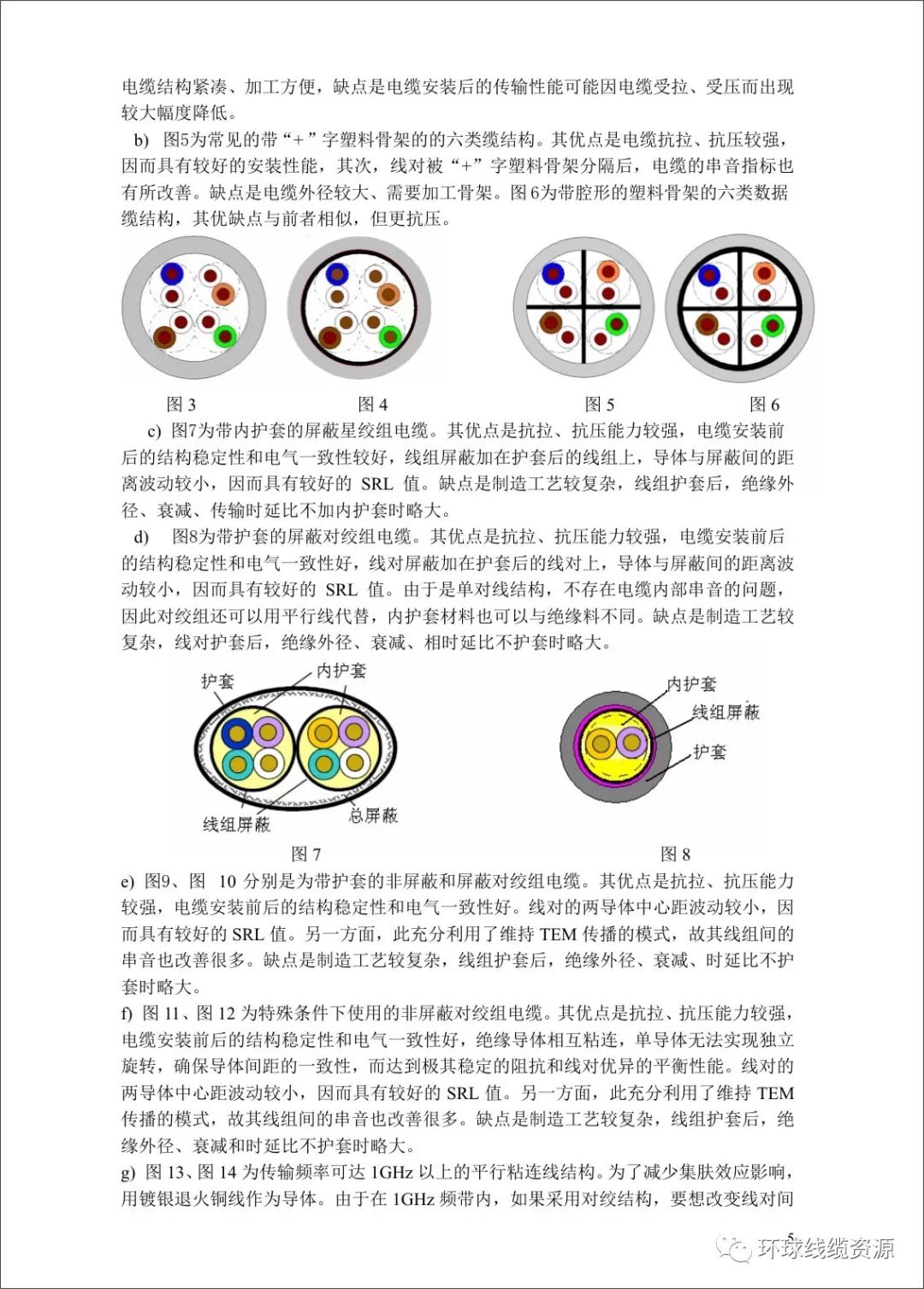 2.图3为常见的带十字塑料骨架和带腔形塑料骨架的六类缆结构。其优点是电缆抗拉、抗压较强(尤其是后者更抗压),因而具有较好的安装性能,其次,线对被十字塑料骨架分隔后,电缆的串音指标也有所改善。缺点是电缆外径较大、需要加工骨架。