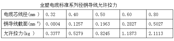 敷设全塑电缆的牵引力应小于全塑电缆允许拉力的80%。全塑电缆标准系列线径铜导线的容许拉力见下表中所示: (见下表)